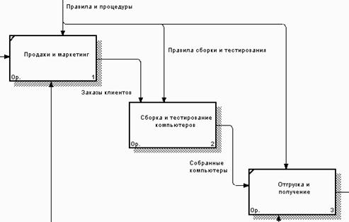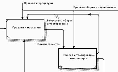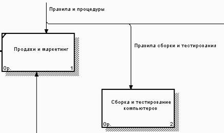 5. Создайте стрелку обратной связи (по управлению) "Результаты сборки и тестирования", идущую от работы "Сборка и тестирование компьютеров" к работе "Продажи и маркетинг". Измените стиль стрелки (толщина линий) и установите опцию Extra Arrowhead (из контекстного меню). Методом drag & drop перенесите имена стрелок так, чтобы их было удобнее читать. Если необходимо, установите Squiggle (из контекстного меню или кнопкой