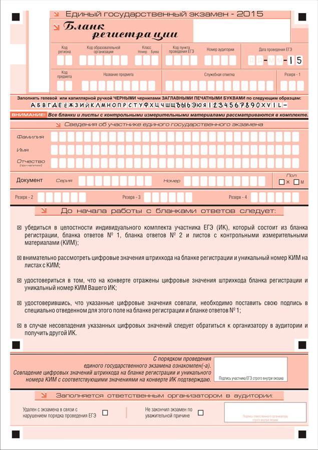 По указанию ответственного организатора в аудитории участником ЕГЭ заполняются все поля верхней части бланка регистрации (см. табл. 1), кроме полей для служебного использования («Служебная отметка», «Резерв-1»).