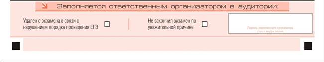 В нижней части бланка регистрации расположена область для отметок организатора в аудитории о фактах удаления участника ЕГЭ с экзамена в связи с нарушением порядка проведения ЕГЭ, а также о том, что участник не закончил экзамен по уважительной причине (рис. 5).