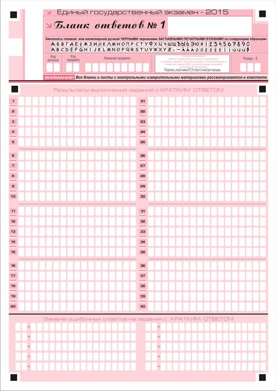 В верхней части бланка ответов № 1 (рис. 6) расположены вертикальный и горизонтальный штрихкод, строка с образцами написания символов, поля для заполнения участником ЕГЭ, а также поле для служебного использования («Резерв-5»). Информация для заполнения полей о коде региона, коде и названии предмета должна быть продублирована с информации, внесенной в бланк регистрации.