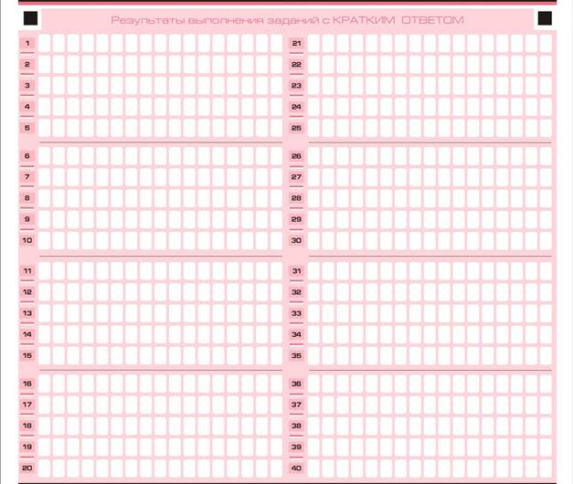 В средней части бланка ответов № 1 размещены поля для записи результатов выполнения заданий с кратким ответом (рис. 7). Максимальное количество ответов – 40 (сорок). Максимальное количество символов в одном ответе – 17 (семнадцать).