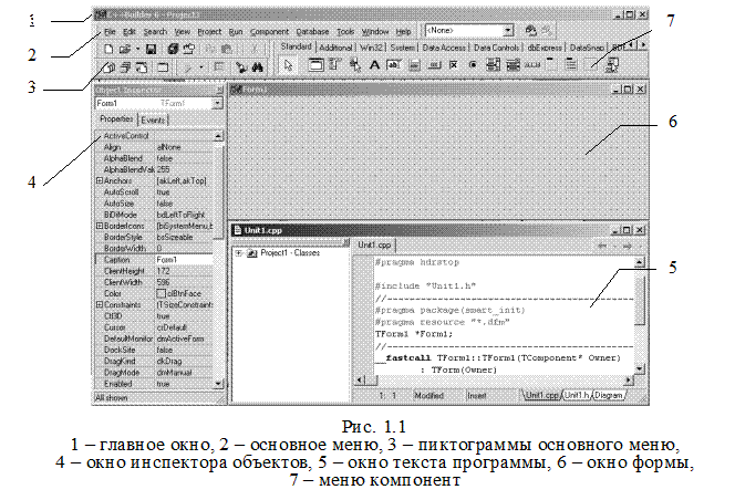 Главное окно предназначено для управления процессом создания программы. Основное меню содержит все необходимые средства для управления проектом. Пиктограммы облегчают доступ к наиболее часто применяемым командам основного меню. Через меню компонент осуществляется доступ к набору стандартных сервисных программ среды, которые описывают некоторый визуальный элемент (компоненту), помещенный программистом в окно формы. Каждая компонента имеет определенный набор свойств, которые задаются Пользователем, например, заголовок окна, надпись на кнопке, стиль выводимого текста и т.п.