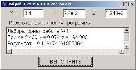 Для исходных данных x = 3,4; y = 7,4×10-2; z = 1,943×102, результат выполнения программы выглядит следующим образом (скриншот результатов):