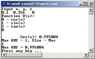 puts("Function U(x):\n 0 - cos(x)\n 1 - sin(x)\n 2 - tan(x)");