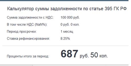 Возьмем задолженность в 100 000 рублей. Посчитаем неустойку. Размер ставки рефинансирования на день исполнения обязательства: 8,25%. Размер ставки рефинансирования за один день составляет: 0,02291666 (8,25%: 360 дней). Сумма банковского процента за один день просрочки оплаты составляет: (100 000 рублей * 0,02%)/100, т.е. 22,91666 рублей в день. Умножаем на 30 дней = 687,50.