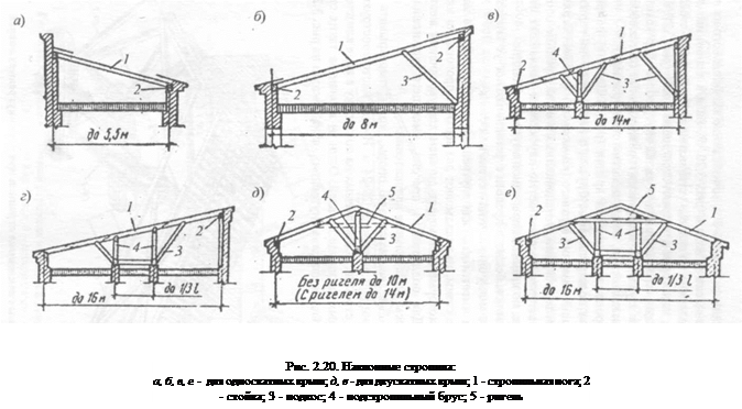 Наклонные стропила двускатной крыши (рис. 2.20, д, е) опирают нижними концами на подстропильные брусья; а верхними - на горизонтальный брус, носящий название верхнего (конькового) прогона. Верхний прогон поддерживается стойками, установленными на внутренние опоры. Таким образом, характерной особенностью двускатных наклонных стропил является наличие, по крайней мере, одной внутренней опоры.