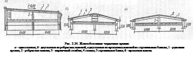 На рис. 2.24, а показана односкатная крыша из железобетонных плит покрытий размером 6,4x1,2 м, укладываемых с уклоном 5% и опирающихся концами на стены здания и железобетонный продольный ригель. Ригель поддерживается кирпичными столбиками сечением 0,51x0,51 м и высотой 1,2 м, располагаемыми через 6,4 м. Плиты связывают между собой через отверстия в ребрах и крепят к стене анкерами. По плитам делается тонкая выравнивающая асфальтовая стяжка и рулонная кровля. Двускатные крыши с уклоном 7-8% могут выполняться из различной конструкции плит, опирающихся на стены здания и среднюю опору (рис. 2.24, б), или из плит размером 2,80x2,85 м, укладываемых по железобетонным стропильным балкам сечением 150x300 мм, располагаемым через 2,8 м и опирающимся на наружные стены здания и внутренние кирпичные столбы (рис. 2.24, в).