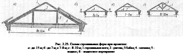Деревянные стропильные фермы простейшего вида (рис. 2.23, б) состоят из двух стропильных ног, соединяемых затяжкой, воспринимающей горизонтальную составляющую передаваемых на опору усилий (распор). Для жесткости и уменьшения прогиба, стропильных ног при пролетах 7-8 м добавочно врезают ригель (рис. 2.23, в), а при пролетах до 10 м устанавливают бабку и подкосы (рис. 2.23, г). Схема стропильной фермы для пролета до 15 м показана на рис. 2.23, а.