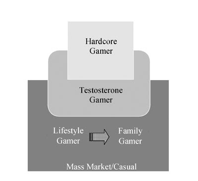 На рисунке видно два смежных слоя: Hardcore Gamer и Mass Market/Casual. Hardcore Gamer является основным источником влияния на Lifestyle и Family gamer. Но кроме вертикального влияния, есть и горизонтальное: Lifestyle gamer могут повлиять на Family gamer.