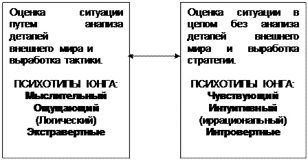 Для сравнительного анализа целесообразно привести схему левополушарных и правополушарных свойств с указанием соответствующих психотипов Юнга (с учетом смысла, который вкладывал Юнг в свои психотипы).