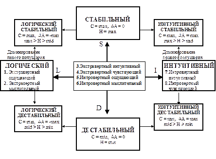Как видно из рис.1.11, все психотипы Юнга расположились по горизонтальной оси (логики - интуиции). Таким образом, по смыслу, который Юнг вкладывает в психотипы, они не выходят за рамки лево-правополушарных представлений (доминирования полушарий). При этом логическому (левополушарному) типу соответствуют 2 типа: экстравертный ощущающий и экстравертный мыслительный. Интуитивному (правополушарному) типу соответствуют еще 2 типа Юнга: интровертный интуитивный и интровертный чувствующий. Остальные 4 типа расположились в центре таблицы и не могут быть дифференцированы, т.к. в равной мере содержат левополушарные и правополушорные свойства. Для их разделения потребуется введение дополнительного параметра - стабильности связи между полушариями. Тогда мыслительные и чувствующие (чувствительные) расположатся по вертикальной оси. Тем не менее, 2 типа останутся неопределенными: экстравертный интуитивный и интровертный ощущающий, т.к. они содержат взаимоисключающие свойства. Экстравертный интуитивный звучит как лево-правополушарный, а интровертный ощущающий - как право-левополушарный. При этом в этих 2-х типах нет признаков о степени стабильности (дестабильности). Поэтому они не могут быть дифференцированы по преимущественному проявлению каких-либо из перечисленных свойств.