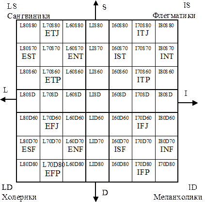 Ниже на рис.1.12. представлена таблица 49 типов с проекцией 16 типов, каждый из которых состоит из 3-х символов Майерс-Бриггс.
