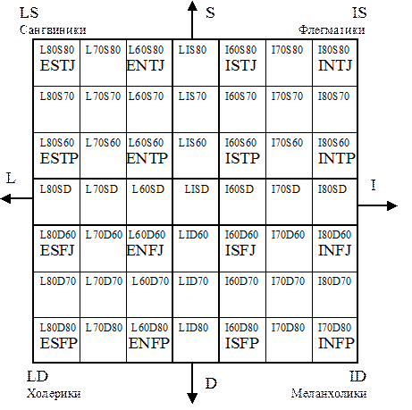 Ниже на рис.1.14 приводится таблица 49 типов, на которую спроецированы вычисленные по вышеуказанному алгоритму 49 типов по Майерс-Бриггс.