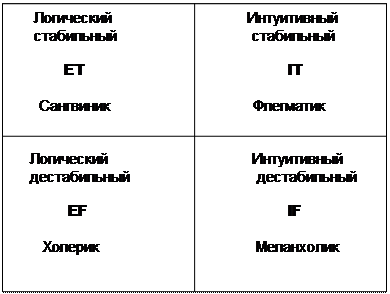 Отсюда очевидно, что для сангвиников общими являются буквы ЕТ, что означает экстраверсию(Е) и мыслительность(Т). Экстраверсия соответствует логическому (левополушарному) типу, а мыслительность соответствует стабильности. Поэтому ЕТ соответствует Логическому стабильному типу - сангвинику.