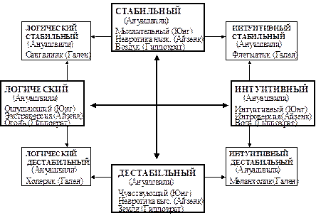 Обобщение известных типологий и сведение их к одной схеме (рис.1.16) на основе авторской типологии наглядно показывает, что известные типологии представляют собой частные случаи одной общей закономерности, которая легко выводится на основе доминирования одного из полушарий головного мозга и степени стабильности связи между ними.