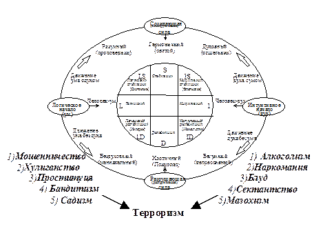 Из схемы (рис.1.20) видно, что все антисоциальные типы, включая террористов, отличаются тем, что находятся под преимущественным воздействием разрушающей силы природы и имеют низкую степень гармонии личности. Террорист имеет естественную внешнюю маскировку, но его достаточно легко можно распознать с помощью данного метода определения психологического типа, позволяющего также вычислить степень гармонии личности. Террорист замаскирован даже от самого себя и действует под благородным мотивом. Поэтому он является "невидимым врагом" для себя и окружающих.