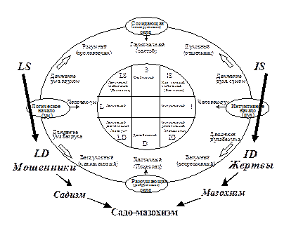 С психологической точки зрения мошенником может стать тот, кто из логически-стабильного положения (LS) переходит в логически-дестбильное положение (LD). При этом у него подавляется функция правого полушария (моральные принципы). Жертвой может стать тот, кто из интуитивно-стабильного положения (IS) переходит в интуитивно-дестабильное положение (ID) и при этом у него подавлена функция левого полушария). (практический ум). Далее мошенник и жертва неосознанно стремятся друг к другу и сходятся вместе в хаосе и садо-мазохизме (см. рис.1.21)