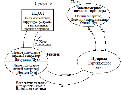 Идолопоклонство возникает тогда, когда нарушается приведенный выше механизм гармонического сочетания человека с окружающим миром (раздел 1.1.3). Идолопоклонство подразумевает появление между человеком и закономерным началом природы посредника – идола (см. рис.1.22).