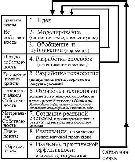 На рис. 2.4. приводится схематическое изображение процесса создания и реализации интеллектуальной собственности, созданной в результате научного творчества.