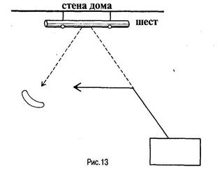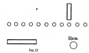 обходный путь имеет еще меньше отношения к конечной цели и внешне выделяется, как совершенно особое действие. Опыт показывает, что мы выносим особенно сильное впечатление разумного поведения тогда, когда используются в замкнутой форме «обходные пути», в отдельных частях столь далеко уводящие от конечной цели, но в целом существенно необходимые. (26. III) Султан сидит у решетки и не может достать при помощи короткой палки, находящейся в его распоряжении, лежащую снаружи цель; между тем снаружи, приблизительно в 2 м в стороне от цели, но ближе к решетке, лежит более длинная палка параллельно плоскости решетки; ее тоже нельзя достать рукой, но можно притянуть при помощи короткой палки (ср. рис. 12).