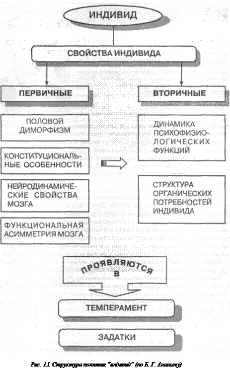 Человек как индивид обладает определенными свойствами (рис. 1.1). Ананьев выделял первичные и вторичные свойства индивида. К первичным он относил свойства, присущие всем людям, такие как возрастные особенности (соответствие определенному возрасту) и половой диморфизм (принадлежность к определенному полу), а также индивидуально-типические характеристики, в том числе конституциональные особенности (особенности сложения тела), нейродинамические