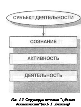Следующее понятие, которое выделял Ананьев при изучении человека, — «субъект деятельности». Это понятие по своему содержанию занимает промежуточное положение между понятиями «индивид» и «личность». Субъект деятельности соединяет в единое целое биологическое начало и социальную сущность человека. Если бы человек не обладал способностью выступать в качестве субъекта деятельности, то вряд ли он мог бы рассматриваться как социальное существо, поскольку его эволюция и социальное развитие невозможны без деятельности.