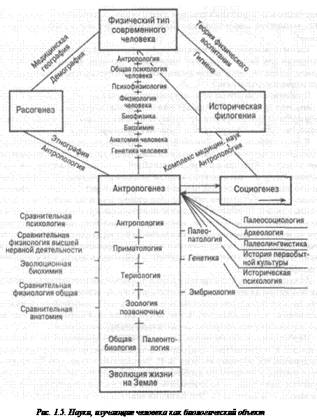 Специальной наукой о человеке как особом биологическом виде является антропология. В структуру современной антропологии включают три основных раздела: морфология человека (изучение индивидуальной изменчивости физического типа, возрастных стадий — от ранних стадий зародышевого развития до старости включительно, полового диморфизма, изменения физического развития человека иод влиянием различных условий жизни и деятельности), учение об антропогенезе (об изменении природы ближайшего предка человека и самого человека в течение четвертичного периода), состоящее из приматоведения, эволюционной анатомии человека и палеоантропологии (изучающей ископаемые формы человека) и расоведение.