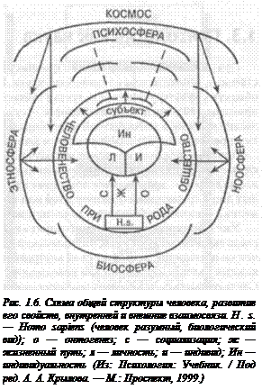 Таким образом, человек как представитель биологического вида является объектом изучения многих наук, в том числе и психологии. На рис. 1.5 представлена классификация Б. Г. Ананьева основных проблем и наук о Homo sapiens. Центральное место среди наук, изучающих происхождение и развитие человека как самостоятельного биологического вида, занимает антропология. Основной вывод, который позволяет сделать современное состояние антропологии в отношении развития человека, может быть сформулирован следующим образом: на каком-то этапе биологического развития произошло выделение человека из животного мира (пограничный этап «антропогенеза- социогенеза») и в эволюции человека прекратилось действие естественного отбора, основанного на биологической целесообразности и выживании наиболее приспособленных к природной среде особей и видов. С переходом человека из животного мира в социальный, с его превращением в биосоциальное существо законы естественного отбора сменились качественно иными законами развития.