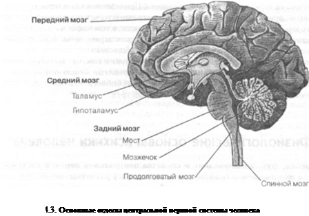 Нервная система человека состоит из двух разделов: центрального и периферического. Центральная нервная система (ЦНС) состоит из головного и спинного мозга. Головной мозг состоит, в свою очередь, из переднего, среднего и заднего мозга. В этих основных отделах центральной нервной системы также выделяются важнейшие структуры, имеющие непосредственное отношение к функционированию психики человека: таламус, гипоталамус, мост, мозжечок, продолговатый мозг (рис. 4.3).