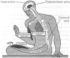 Любая сенсомоторная реакция рассматривалась как самостоятельное действие или элемент сложного психомоторного акта. С физиологической точки зрения сенсомоторные реакции рассматривались как условные рефлексы. Поясним эту точку зрения на примере (рис. 5.2). В ответ на укус комара человек невольно отдернул ногу — это безусловный рефлекс (1). Центральный момент его протекает в низших отделах нервной системы, хотя он также имеет свое корковое представительство, вследствие чего человек почувствовал боль. Одновременно боль вызвала изменение частоты сокращений сердца — это вегетативная реакция (2), которая связана с деятельностью вегетативной нервной системы; она замыкается в подкорковых узлах мозга, но также имеет свое корковое представительство. Рефлекторное движение ноги могло не согнать комара, и человек, до сознания которого дошла боль, ударил рукой по комару, осуществив произвольное психомоторное действие (3). Вместе с тем это движение рукой было и его сенсомоторной реакцией, центральный момент которой протекал в коре головного мозга. Этот же моторный момент мог завершить и другую сенсомоторную реакцию. Человек мог не чувствовать боли, а увидеть комара, когда он еще только садился на ногу. В обоих случаях движения руки могли быть совершенно одинаковыми, но во втором случае сенсорным моментом служило бы уже не тактильное, а зрительное восприятие. Соответственно изменилась бы и локализация центрального момента реакции в мозге.