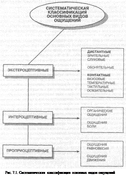 Рассмотрим систематическую классификацию ощущений (рис. 7.1). Данная классификация была предложена английским физиологом Ч. Шеррингтоном. Рассматривая наиболее крупные и существенные группы ощущений, он разделил их на три основных типа: интероцептивпые, проприоцептивные и экстероцептив-ные ощущения. Первые объединяют сигналы, доходящие до нас из внутренней среды организма; вторые передают информацию о положении тела в пространстве и о положении опорно-двигательного аппарата, обеспечивают регуляцию наших движений; наконец, третьи обеспечивают получение сигналов из внешнего мира и создают основу для нашего сознательного поведения. Рассмотрим основные типы ощущений по отдельности.