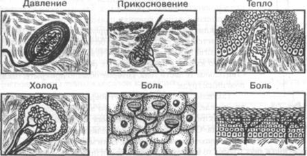 которые человек получает от кожных рецепторов, можно объединить под одним названием — кожные ощущения. Однако к категории этих ощущений необходимо отнести и те ощущения, которые возникают при воздействии раздражителей на слизистую оболочку рта и носа, роговую оболочку глаз.