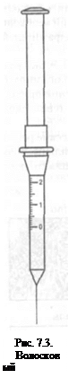 Нормальными раздражителями для тактильных рецепторов являются прикосновения, вызывающие деформацию кожи, для холодовых — воздействие предметов более низкой температуры, для тепловых — воздействие предметов более высокой температуры, для болевых — любые из перечисленных воздействий при условии достаточно большой интенсивности. Местонахождение соответствующих рецепторных точек и абсолютные пороги чувствительности определяются с помощью эстезиометра. Простейший прибор — волосяной эстезиометр (рис. 7.3), состоящий из конского волоса и прибора, позволяющего измерять давление, оказываемое этим волосом на любую точку кожи. При слабом прикосновении волоса к коже ощущения возникают только при непосредственном попадании в тактильную точку. Аналогично определяют местонахождение холодовых и тепловых точек, только вместо волоса используют тонкое металлическое острие, наполненное водой, температура которой может меняться.