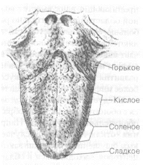 Экспериментальным путем также было установлено, что различные части языка имеют различную чувствительность к четырем вкусовым качествам. Например, чувствительность к сладкому максимальна на кончике языка и минимальна у задней части его, а чувствительность к горькому, наоборот, максимальна сзади и минимальна па кончике языка.