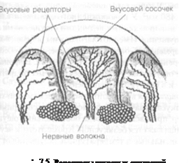Вкусовые и обонятельные ощущения. Рецепторами вкусовых ощущений являются вкусовые луковицы, состоящие из чувствительных вкусовых клеток, соединенных с нервными волокнами (рис. 7.5). У взрослого человека вкусовые луковицы расположены главным образом на кончике, но краям и на задней части верхней поверхности языка. Середина верхней поверхности и вся нижняя поверхность языка не чувствительна к вкусу. Вкусовые луковицы также имеются на нёбе, миндалинах и задней стенке глотки. У детей область распространения вкусовых луковиц гораздо шире, чем у взрослых. Раздражителями для вкусовых рецепторов служат растворенные вкусовые вещества.