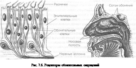 Рецепторами обонятельных ощущений являются обонятельные клетки, погруженные в слизистую оболочку так называемой обонятельной области (рис. 7.6). Раздражителями для рецепторов обоняния служат различные пахучие вещества,
