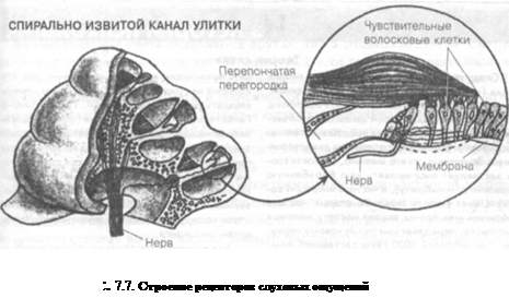 Наилучшее объяснение природы слуховых ощущений дает резонансная теория слуха Гельмгольца. Как известно, концевым аппаратом слухового нерва является орган Корти, покоящийся на основной перепопке, идущей вдоль всего спирального костного канала, называемого улиткой (рис. 7.7). Основная перепонка состоит из большого количества (около 24 ООО) поперечных волокон, длина которых постепенно уменьшается от вершины улитки к ее основанию. По резонансной теории Гельмгольца, каждое такое волокно настроено, подобно струне, на определенную частоту колебаний. Когда до улитки доходят звуковые колебания определенной частоты, то резонирует определенная группа волокон основной перепонки и возбуждаются только те клетки органа Корти, которые покоятся на этих волокнах. Более короткие волокна, лежащие у основания улитки, реагируют на более высокие звуки, более длинные волокна, лежащие у ее вершины, — на низкие.