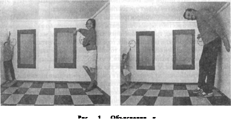 Роль обратной связи в перестройке восприятия убедительно раскрывается и в опытах Кил-патрика по восприятию пространственных взаимоотношений в деформированных комнатах (рис. 1). Эти опыты заключались в демонстрации деформированных комнат, сконструированных так, что при определенном положении наблюдателя они воспринимались как нормальные: возникшая от них на сетчатке конфигурация была тождественна получаемой от обычных комнат. Чаще всего показывались комнаты, стены которых образуют острые и тупые углы. Наблюдатель, сидевший у смотрового отверстия, тем не менее воспринимал такую комнату как нормальную. На задней ее стене он видел маленькое и большое окна. В действительности же окна имели равные размеры, но вследствие того, что одна стена была расположена значительно ближе к наблюдателю, чем другая, ближнее окно казалось ему больше, чем дальнее. Если затем в обоих окнах появлялись знакомые лица, то наблюдатель бывал потрясен необъяснимым для него различием в размерах лиц, чудовищной величиной лица в «дальнем» окне.