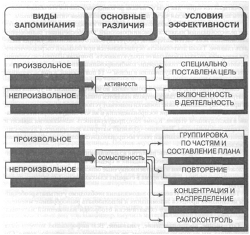 Следует отметить, что успех запоминания во многом зависит от уровня самоконтроля. Проявлением самоконтроля являются попытки воспроизвести материал при его заучивании. Такие попытки помогают установить, чт€о мы запомнили, какие ошибки допустили при воспроизведении и на что следует обратить внимание в последующем чтении. Кроме того, продуктивность запоминания зависит и от характера материала. Наглядно-образный материал запоминается лучше словесного, а логически связанный текст воспроизводится полнее, чем разрозненные предложения.