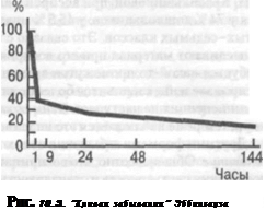 тем же оно идет медленнее (рис. 10.3). Причем такая же закономерность характерна и для забывания осмысленного материала. Подтверждением этого может служить эксперимент, прове-денный американским психологом М. Джонсом. Эксперимент сводился к следующему: до начала лекции по психологии Джонс предупредил студентов, что в конце они получат листочки с вопросами по содержанию лекции, на которые надо дать письменные ответы. Лекция читалась со скоростью 75 слов в минуту, четко и доступно. Письменный опрос был проведен пять раз через разные интервалы времени. Результаты получились следующие: сразу после лекции студенты правильно воспроизвели 65 % основных мыслей лекции, спустя три-четыре дня после лекции — 45,3%, спустя одну неделю — 34,6%, спустя две недели — 30,6% и спустя восемь недель — 24,1 %. У выдающегося лектора, приглашенного для сравнения данных, получалось почти то же самое: студенты сразу же после лекции воспроизводили 71 % основных его мыслей, а далее шло забывание воспринятого материала: сначала быстрее, а затем несколько медленнее. Из данного опыта следует вывод, что если студенты не будут работать над закреплением учебного материала в памяти, через два месяца от пего останется лишь 25 %, а наибольшая потеря (55 %) произойдет за первые три-четыре дня после восприятия.