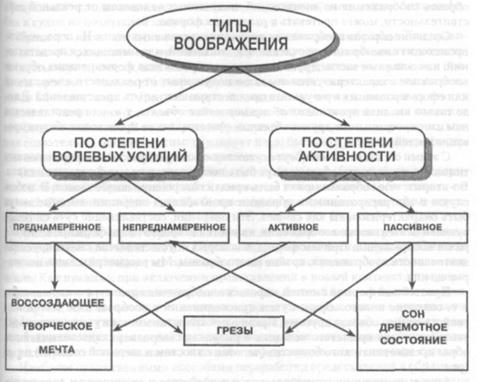 Среди различных видов и форм произвольного воображения можно выделить воссоздающее воображение, творческое воображение и мечту.