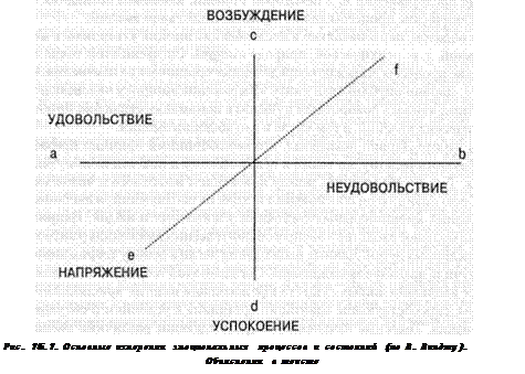 Говоря о классификации эмоциональных состояний, мы не отметили тот факт, что неоднократно предпринимались попытки выделить общие для всех эмоциональных состояний признаки. Одна из таких попыток принадлежит В. Вундту. По мнению Вундта, всю систему чувств можно определить как многообразие трех измерений, в котором каждое измерение имеет два противоположных направления, исключающих друг друга. Эту систему координат можно представить графически (рис. 16.1). Она характеризует знак эмоций, степень возбуждения и напряжения, но данный подход уже не соответствует информации, накопленной в процессе исследования эмоций. Например, в системе координат, предложенной В. Вунд-тоМ, отсутствует такая характеристика, как длительность эмоциональной реакции.