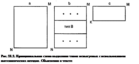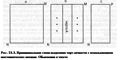 Обобщение данных путем группировки признаков (по столбцам) состоит в выделении групп тесно связанных признаков при помощи методов факторного анализа. Факторный анализ представляет собой систему моделей и методов для преобразования исходного набора признаков в более простую и содержательную форму. Он базируется на предположении, что наблюдаемое поведение испытуемого может быть объяснено с помощью небольшого числа скрытых характеристик, называемых факторами. На рис. 21.1. схематически проиллюстрирован принцип выделения черт. Предположим, что у нас имеется определенная матрица данных (А-В), в которой учтены все испытуемые и все изучаемые нами психологические характеристики. Данную матрицу с помощью факторного анализа мы разбиваем по столбцам на подматрицы. В результате получаем некоторый набор вертикальных полосок (b). Каждая из таких полосок, или подматриц, содержит информацию по всем испытуемым, но не по всем признакам, а лишь по группе тесно коррелирующих (взаимосвязанных) характеристик. Эти взаимосвязанные характеристики содержат информацию о какой-то более обобщенной характеристике. Поэтому все характеристики, вошедшие в одну вертикальную полоску, или столбец, могут быть заменены интегральным для них признаком — фактором. В результате имеющуюся у нас матрицу данных благодаря замене близких характеристик на обобщенные признаки мы можем «сжать», или упорядочить. Что это дает для экспериментальных исследований?