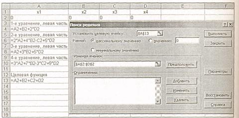 После этого запускают Поиск решения. Возможный вид экрана для подготовки к решению той же системы, что и выше, приведен на рис. На этом рисунке под переменные отведены ячейки A2:D2, под формулы — ячейки А4, А6, А8 и А10. Какие именно числовые значения переменных будут введены в ячейки A2:D2, при решении системы линейных уравнений значения не имеет (итерационная процедура, заложенная в Поиск решения, стартует с этих значений).