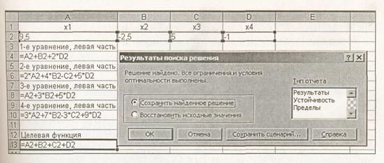 В форму, изображенную на рис. 3. надо ввести четыре условия (по числу уравнений системы). На рисунке отражено последнее условие. Ссылка на ячейку А10 обусловлена тем, что в ней -формула для левой части 4-го уравнения, знак '=' выбран из меню, число (-13) введено с клавиатуры (правая часть 4-го уравнения). После ввода последнего ограничения нажимают кнопку ОК и возвращаются в основную форму Поиск решения. Щелкнув по кнопке Выполнить, получают результат (рис. 4).