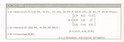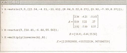 Решение систем линейных уравнений (см. пример 1) матричным методом в Maple (рис. 5) реализуют два класса функций:
