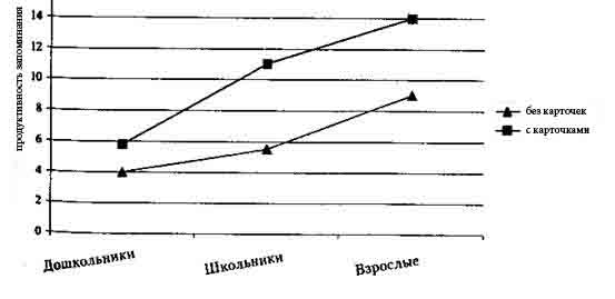 яции. Основная задача, например, запомнить 20 слов – это первый ряд стимулов. Не заучить, а запомнить, чтобы сразу же воспроизвести. Второй ряд стимулов это средства. Предъявляются слова для запоминания[234]. Когда испытуемому назвали слово, он может взять карточку, как-то связать с ней слово и положить карточку перед собой. В результате, когда предъявили слова перед испытуемым лежит 20 карточек. Продуктивность запоминания при этом повышается, правда смотря в каком возрасте. Группы дошкольников, младших школьников и взрослые студенты. По оси Y продуктивность запоминания слов как показатель выполнения основной задачи.