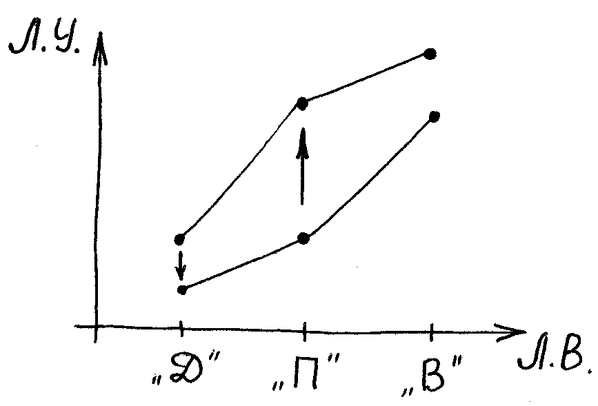 Ось y – личностное участие (степень личностного участия) в терапевтическом сеансе. Теперь совершаем те же графические действия. Теперь над каждым уровнем личностного развития ставим точки. Повторяем тот же рисунок – соединяем нижние точки, ставим цифру I и говорим: это – пациент (имеем в виду пациента), затем – соединяем верхние точки, ставим II и говорим: это – терапевт. Так мы превратили когда-то наполненный одним смыслом рисунок [в схему, иллюстрирующую] основные виды психотерапии.