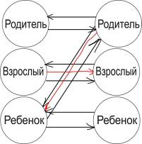 Внутреннюю структуру общения моделирует Бёрн. Он вскрывает прежде всего структуру субъекта общения, в котором Бёрн выделяет три инстанции. Это ребёнок (субъект неуправляемых желаний; неконтролируемых эмоциональных состояний), взрослый (субъект принятия решений в конкретных социальных ситуациях) и родитель (носитель культурных принципов, ценностей, установок). У Бёрна особый язык. Если общение это игра, то отдельный акт общения он назовёт сделкой. И самое общее правило, что сделало популярными его книги. Акт общения должна быть параллельной. Но подобные примеры довольно редки и идеальны, а реальное общение будет продолжаться также только тогда, когда родитель обращается к ребенку и ребенок же обращается к нему. Это позитивный вариант. А негативный: семейное общение муж жене «где мои запонки?» (взрослый к взрослому), ответ надо дать «по ищи на столе», но не так отвечает жена, а «вечно ты разбрасываешь свои вещи». Взрослый получил в ответ получил связь родитель-ребенок.