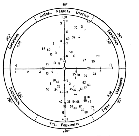 Когда данных стало много, и Шлосбергу удалось применить факторный анализ, он построил шкалу. Не шкалу эмоций – такие попытки едва ли имеют четкий результат – а шкалу мимического выражения эмоций можно построить... Замкнулось в круг – круг Шлосберга, шкала мимического выражения эмоций. В книге Рейковского сказано подробно. Интересна последовательность эмоций – любовь, удивление, испуг. Это не сами эмоции – это шкалирование их идентификации по мимике. Страх (противоположный конец), гнев, иногда и ярость... И поднимаемся вверх – отвращение, презрение. Круг замкнулся.